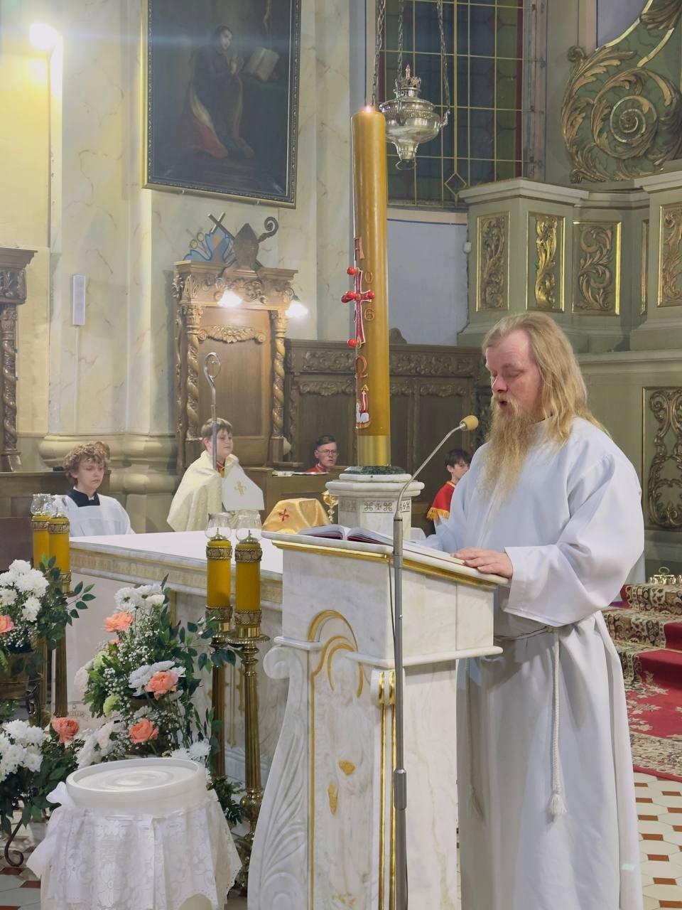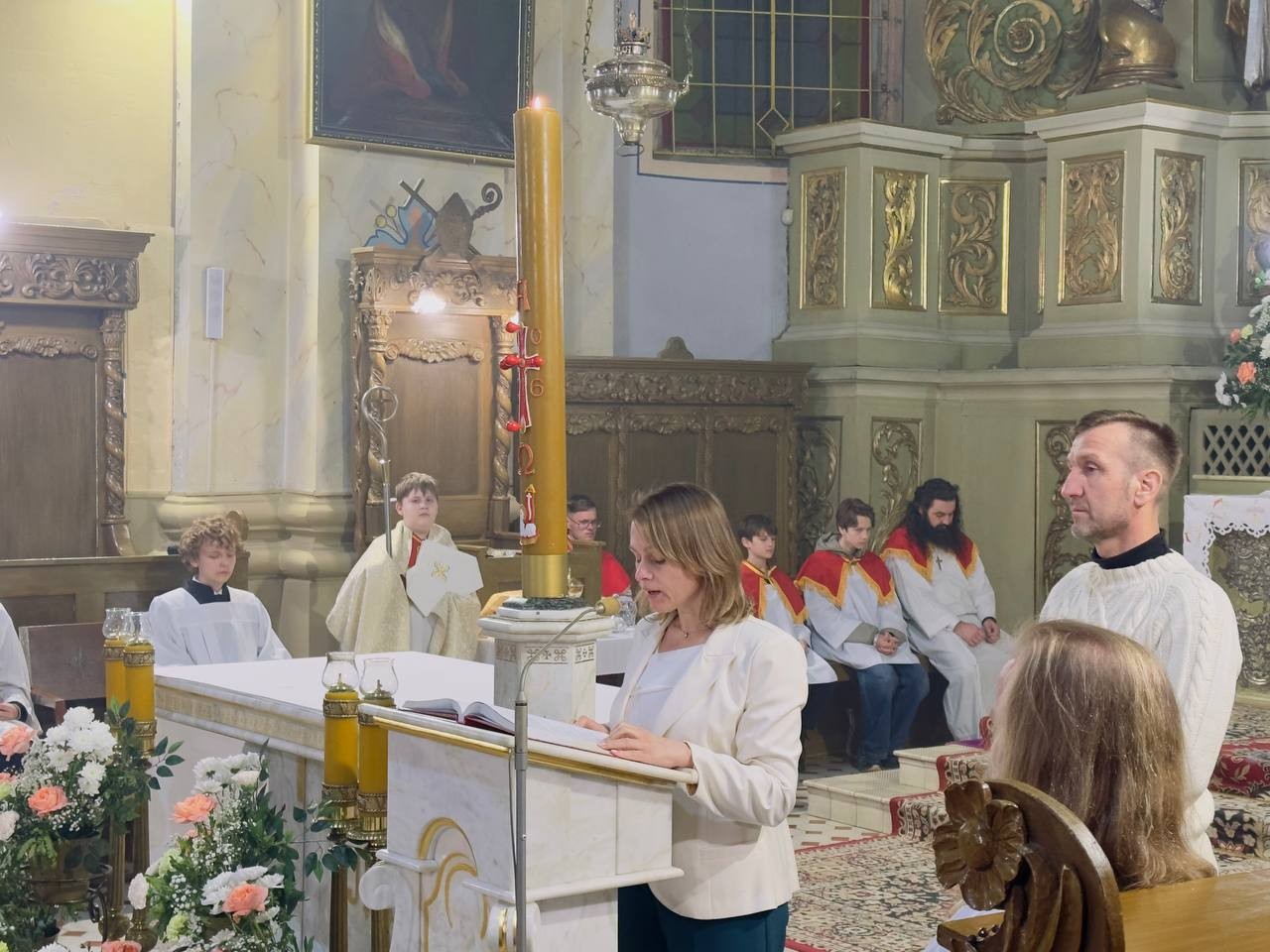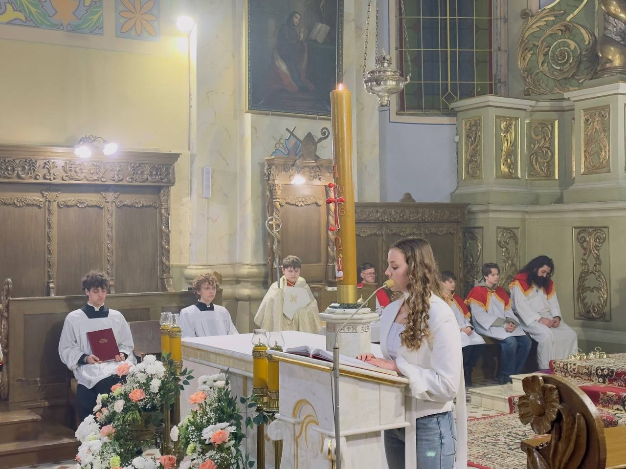 Традыцыйна літургія распачалася з асвячэння пасхальнага агню і запальвання свечак. Першай біскуп запаліў асвечаным агнём вялікую свечку — пасхал — сімвал Уваскрослага Хрыста. Ад яго са спевам «Хрыстус Уваскрос!» вернікі запалілі свае свечкі, пры якіх пазней адбыўся абрад аднаўлення абяцанняў, дадзеных Богу кожным вернікам падчас прыняцця сакрамэнту хросту.