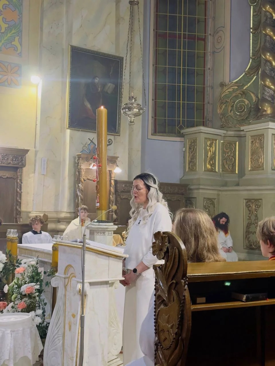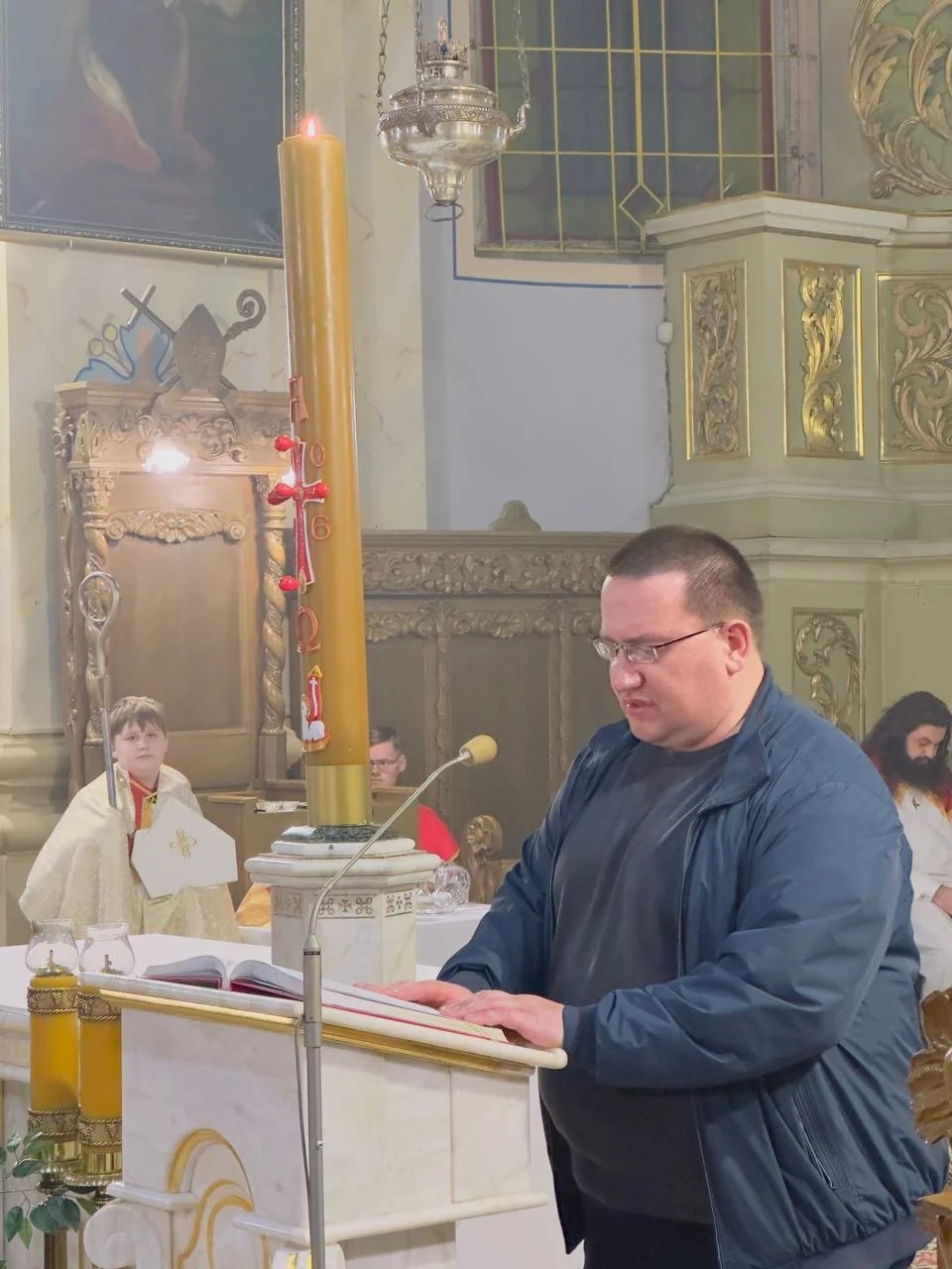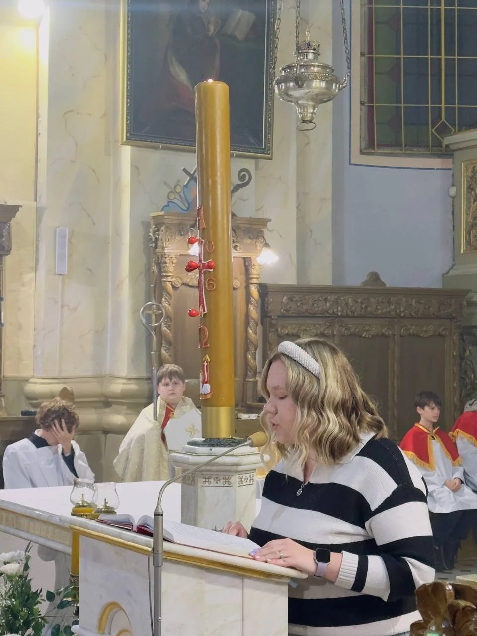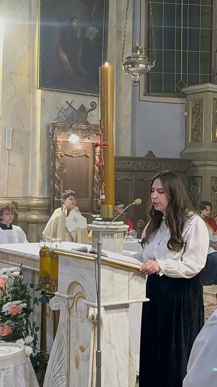 Традыцыйна літургія распачалася з асвячэння пасхальнага агню і запальвання свечак. Першай біскуп запаліў асвечаным агнём вялікую свечку — пасхал — сімвал Уваскрослага Хрыста. Ад яго са спевам «Хрыстус Уваскрос!» вернікі запалілі свае свечкі, пры якіх пазней адбыўся абрад аднаўлення абяцанняў, дадзеных Богу кожным вернікам падчас прыняцця сакрамэнту хросту.